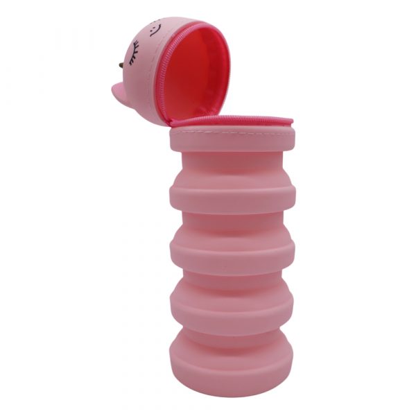 Astuccio verticale in silicone allungabile a forma di unicorno rosa. Cerniera in microiniezione. Quando è chiuso occupa pochissimo spazio.