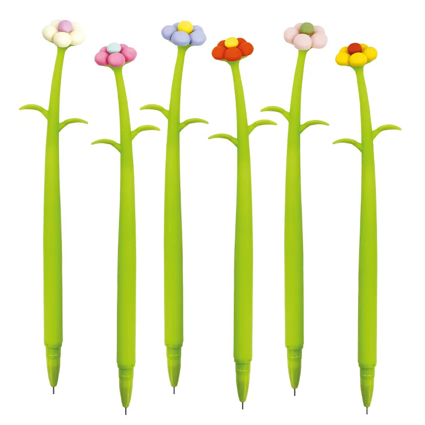 Penna in morbido silicone con soggetto fiore. Disponibile in 6 colori (chiedere prima dell'ordine qualora si desideri un colore particolare. In caso contrario verranno spedite casualmente). Inchiostro a gel blu con punta a spillo da 0,4 mm.
