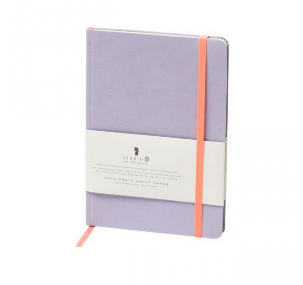 Colori pastello e raffinata semplicità, questo è il taccuino con copertina morbida in tessuto lilla ed elastico a contrasto.